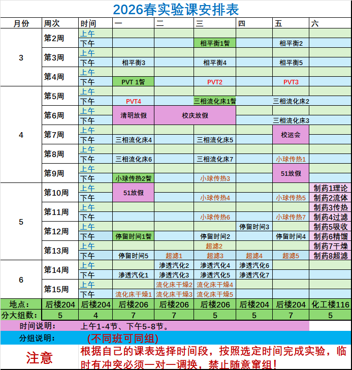 2026春学期《过程装备与控制工程专业实验》课时安排表